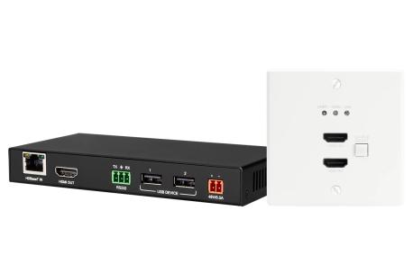 Kit a muro low-profile con trasmettitore e ricevitore HDBaseT, progettata per applicazioni AV professionali in ambienti come sale riunioni, aule e spazi di presentazione.