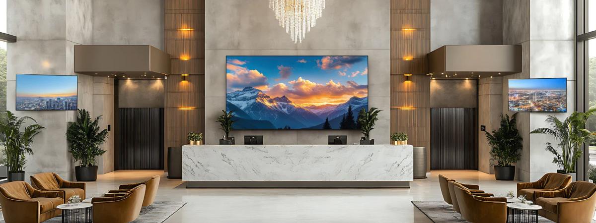 Un altro scenario ricorrente è quello del digital signage distribuito in ambito hospitality o retail. Lobby, sale meeting, corridoi, aree comuni. Qui il tema non è la fedeltà cinematografica del dettaglio, ma la capacità di orchestrare decine di display, aggiornare contenuti, integrare eventualmente flussi live, mantenere tutto stabile nel tempo.