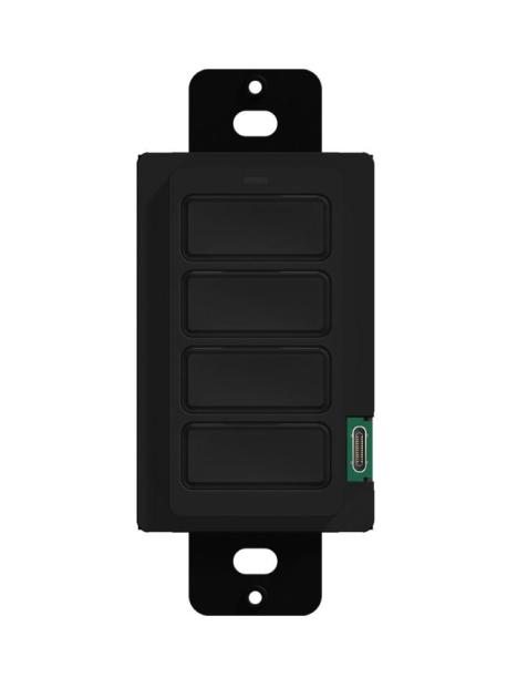Tastierino da parete con 4 tasti completamente programmabili, pensato per un controllo rapido e locale di luci, musica, tende e scenari. Alimentazione e comunicazione via Ethernet (PoE) per cablaggio semplificato; feedback a due vie tramite retroilluminazione con colore configurabile per ogni tasto. Compatibile con scatola US single-gang e placche stile Decora®; programmazione via rete o USB. Fornito con due set completi di placca e cappucci tasto (bianco e nero). Dimensioni (LxPxH): 4,6x4,3x10,4 cm; Peso: 0,11 kg