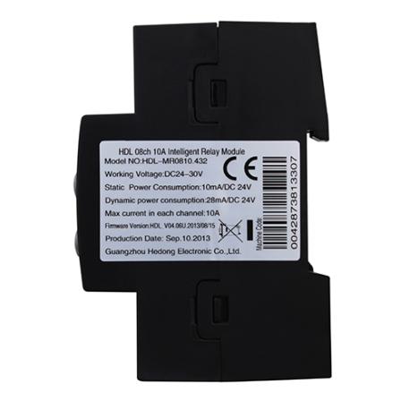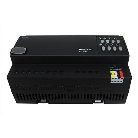 L’attuatore HDL MR0810.432 è un modulo a 8 canali da 10A ciascuno, progettato per la commutazione ad alta potenza in sistemi di automazione residenziale e commerciale. Installabile su guida DIN da 35 mm, integra relè magnetici da 16A che garantiscono consumi ridotti e lunga durata operativa. Ogni canale supporta funzioni avanzate come ritardi di protezione (0–60 minuti) e ritardi di accensione massiva (0–25 secondi), oltre a un controllo manuale locale. La comunicazione avviene tramite HDL Buspro, con possibilità di aggiornamento online e indicazione dello stato tramite LED. Funziona con alimentazione 15–30 VDC, adattandosi facilmente a vari scenari di switching ad alta potenza. Dimensioni: 144×90×66mm.(LxAxP). Peso: 361g.