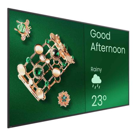 Pannello LCD tipo ADS, illuminazione Direct-LED, Android 14.0, operatività 18/7, orientamento landscape/portrait, compatibile con X-Sign, memoria interna 4/32 GB. Contrasto 1200:1, speaker 12+12 W, angolo di visione 178°/178°, vita approssimativa 30.000 ore. Ingressi: 2 HDMI, 1 minijack audio out, 2 USB, LAN RJ45, RS-232. VESA 200x200, consumo 60 W. Dimensioni (WxHxD): 965x555x59 mm. Peso: 7,9 kg. Finitura nera.